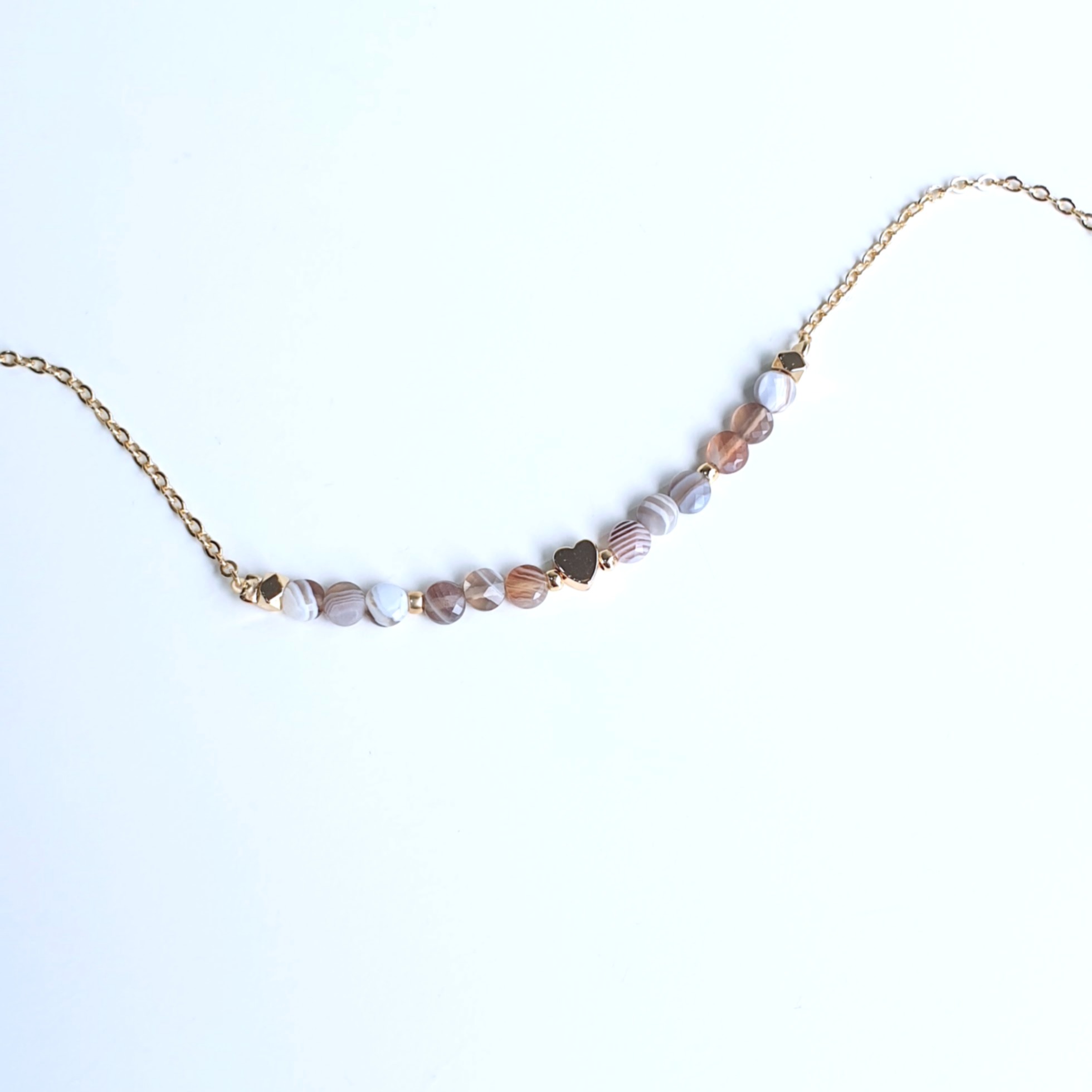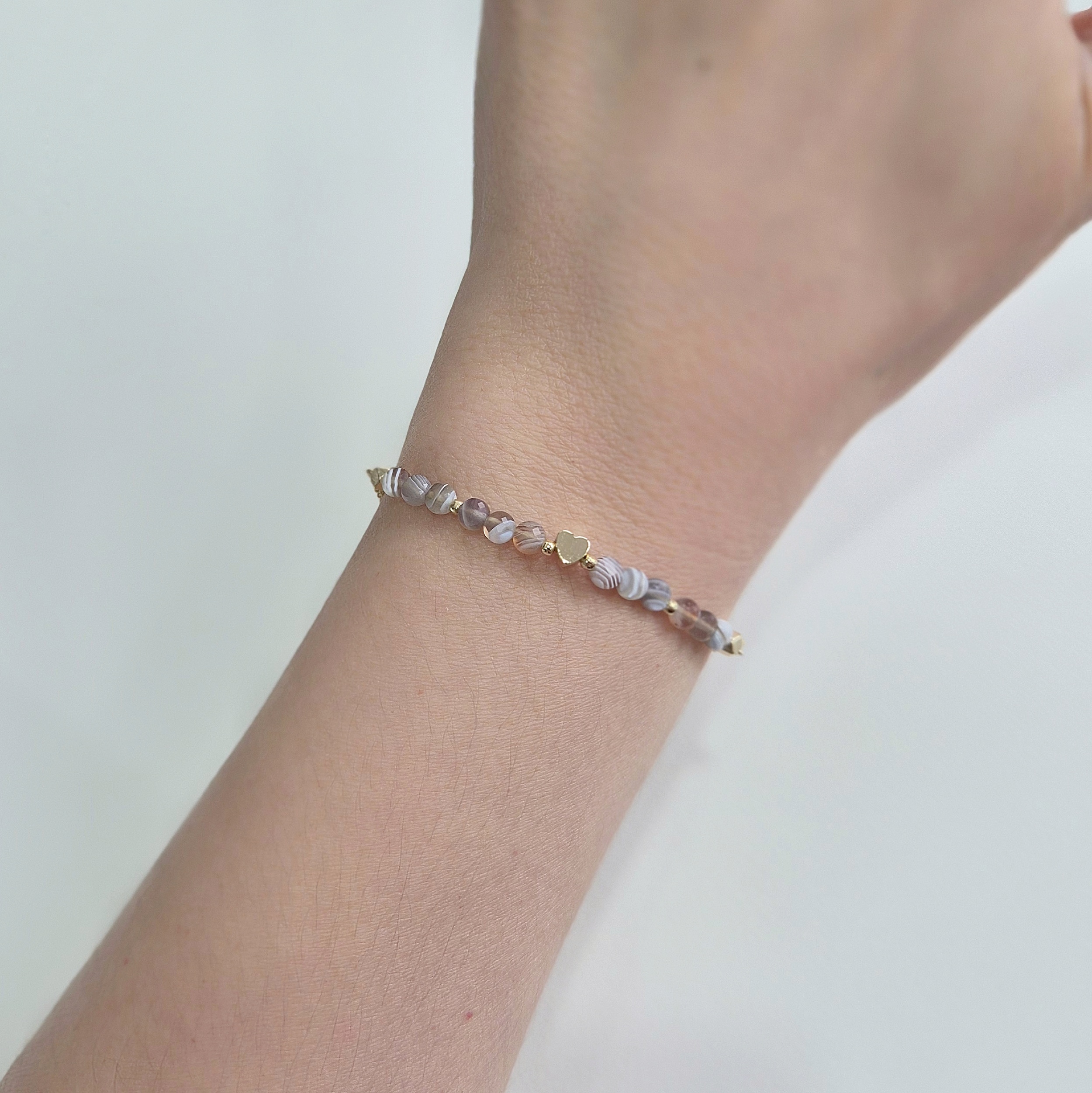 A minimalist chain bracelet featuring soft 4 mm Botswana Agate as the centre focus. Designed for light, everyday wear, this piece brings together a clean, refined look with the gentle healing and protective energy of Botswana Agate — a calming, grounding choice for intentional daily use or meaningful gifting.
